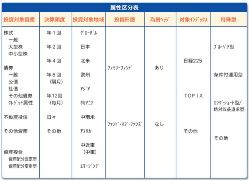協会が定める商品分類に関する指針には、さらなる詳細な投資信託の属性を示す「属性区分」も定められています。
